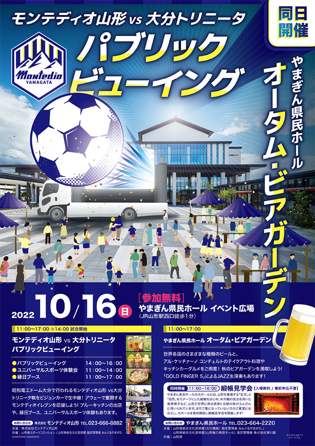 同日開催の「やまぎん県民ホール オータム・ビアガーデン」をお楽しみいただきながら、家族や友人と共にモンテディオ山形のアウェイゲームの応援をお願いします。