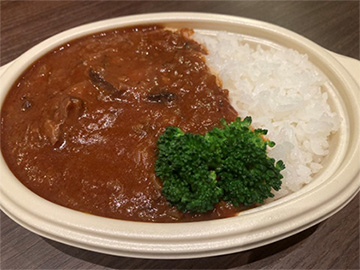 山形牛を赤ワイン、トマト、香味野菜と一緒にじっくり煮込みました。旨味の凝縮したルーは、硬めに炊いた雪若丸にとてもよく合います。