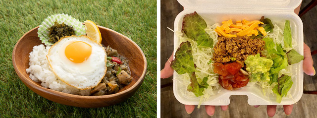 独自のハーブと青唐辛子がアクセントのガパオライス・自家製サルサとスパイスたっぷりミートのタコライス・濃厚トマトチキンビスクをかけてリゾット風ビスクごはんです。