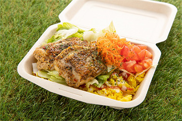 粒立ちが良い雪若丸のサフランライスは甘辛い味付け。ジューシーなグリルチキンと野菜たっぷりなクセになる一品。