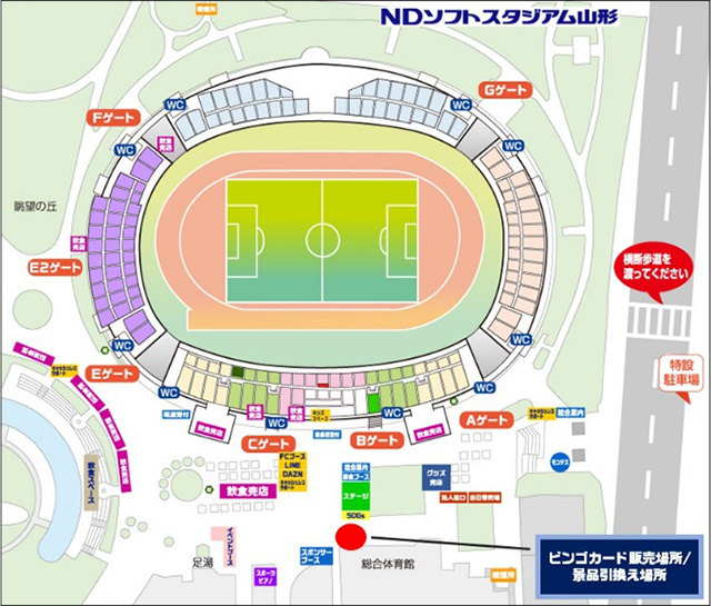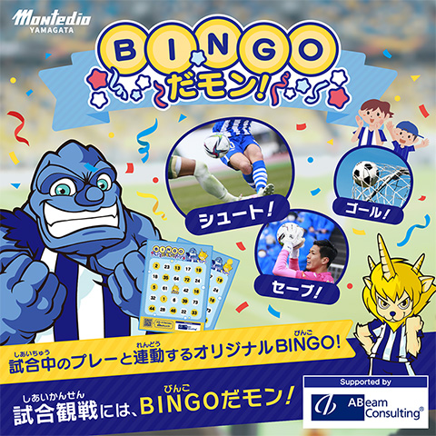 「前半を失点ゼロで終える」、「スタメンに山形出身選手がいる」など試合中に起こるプレーや出場選手の状況など75個の条件がいずれか当たると対応するビンゴカードの数字に穴が開く、ビンゴゲームを展開します。