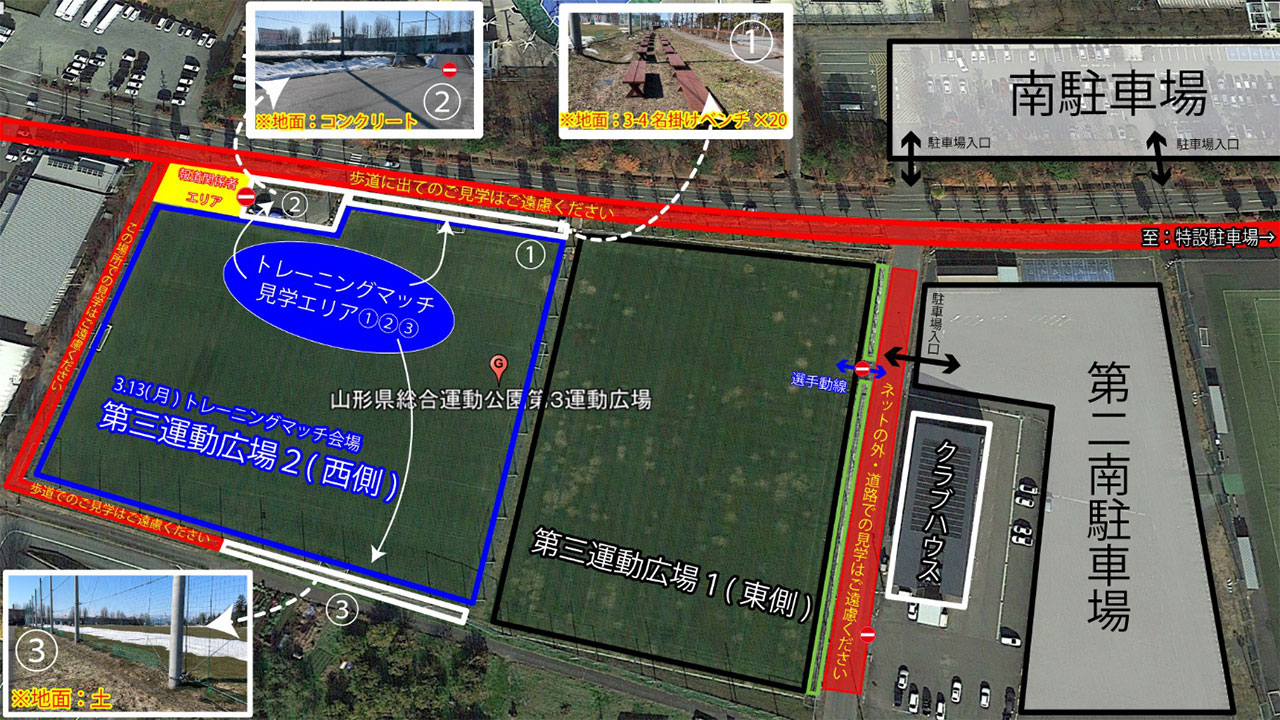 - 天候によっては、第三運動広場2(西側)の練習見学エリア①・②の地面がぬかるんでいることがございますので見学の際はご注意ください。
