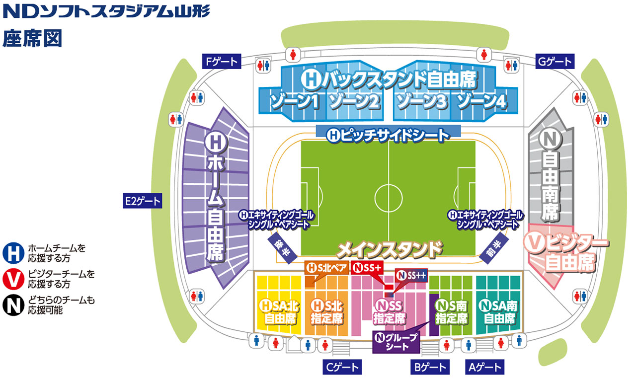 ※メインスタンドSS++指定席、SS+指定席・SS指定席・S南指定席・グループシート・SA南自由席・自由南席がニュートラルエリア(上記図「N」)となり、ビジターチームを応援されるお客様も、ビジターチームユニフォーム着用での観戦が可能です。