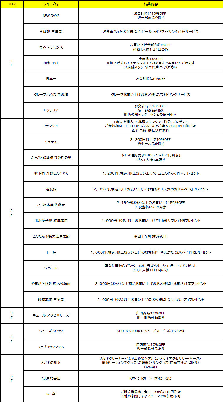 キャンペーン期間中、モンテディオ山形のファンクラブ会員証を提示するとエスパル山形の各ショップにて、別表の特典を受けることができます。本キャンペーンは、エスパル山形さまご協力のもと、YAMAGATAICHIGANでJ1昇格を目指す気運を高めるためのキャンペーンです。