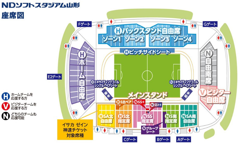 ※メインスタンドSS++指定席、SS+指定席・SS指定席・S南指定席・グループシート・SA南自由席・自由南席がニュートラルエリア(上記図「N」)となり、ビジターチームを応援されるお客様も、ビジターチームユニフォーム着用での観戦が可能です。
