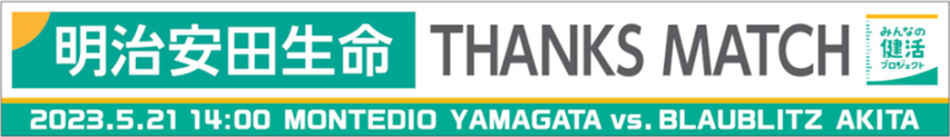 モンテディオ山形では、2023年5月21日開催のホームゲーム、ブラウブリッツ秋田戦を明治安田生命保険相互会社山形支社様による「明治安田生命THANKS MATCH」として開催いたします。