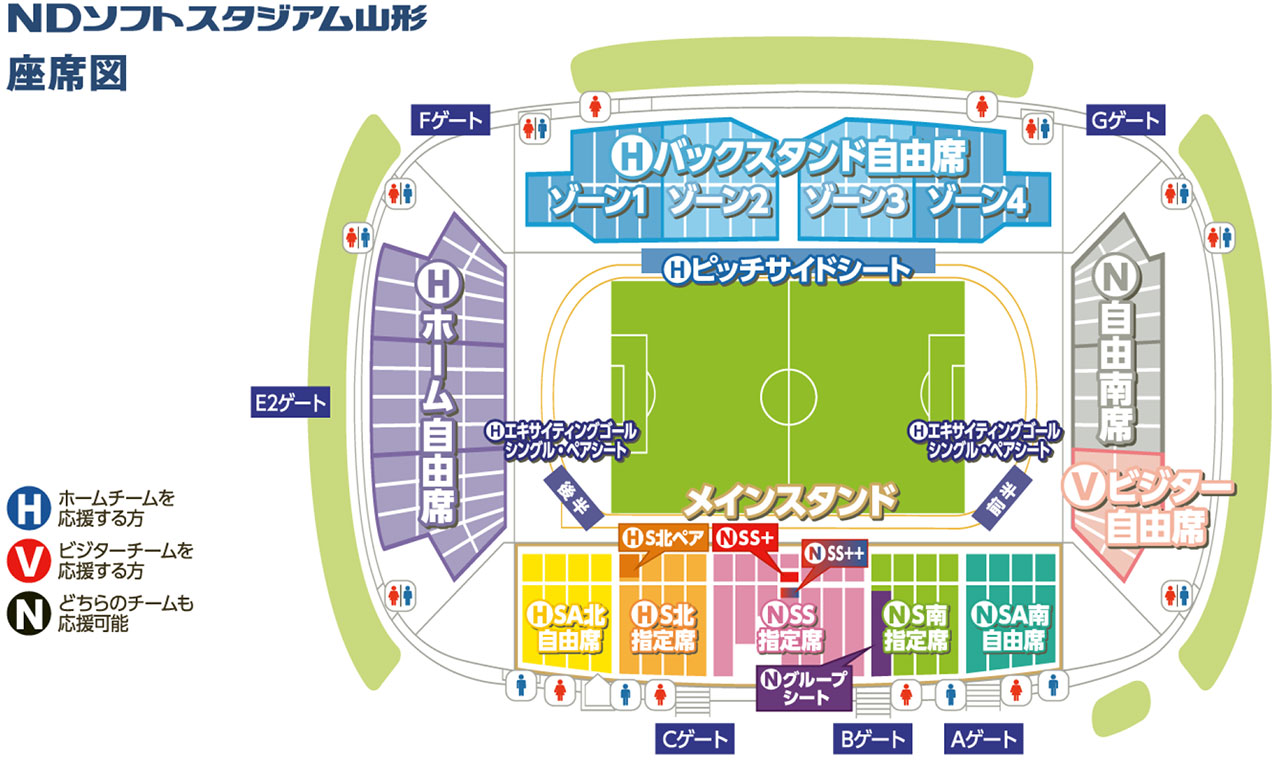 ※メインスタンドSS++指定席、SS+指定席・SS指定席・S南指定席・グループシート・SA南自由席がニュートラルエリア(上記図「N」)となり、ビジターチームを応援されるお客様も、ビジターチームユニフォーム着用での観戦が可能です。