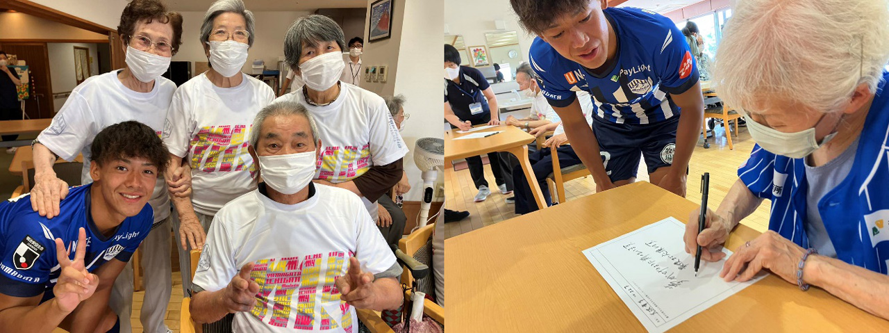 “人生の先輩からのエール”企画では、2023年10月1日(日)開催のホームゲーム徳島ヴォルティス戦において、山形県内の高齢者施設に入居されているみなさまから、モンテディオ山形の選手・クラブへの応援メッセージを広く集め、ホームゲームにて横断幕を掲出いたします。今年はエール集めに選手も参加し入居者の方と交流いたしました。