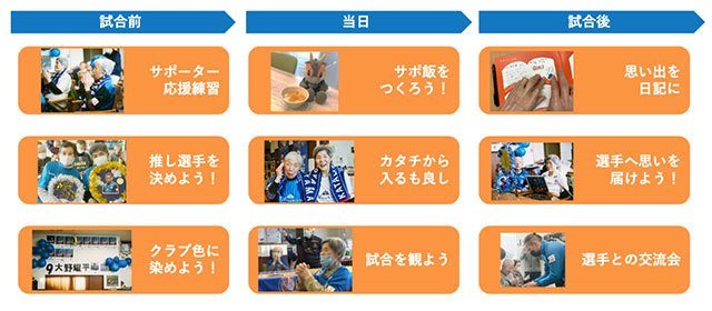 「Be supporters!」プロジェクトでは、高齢者施設で実施できるオリジナルのプログラムを開発しています。「お気に入りの選手を決める」「ユニフォームを着る」「手拍子をする」「タオル回しをする」「“サポ飯”を作る」「施設を飾る」「観戦日記をつける」など、応援を楽しむためのガイドブックも作成し、高齢者施設のみなさまにご利用いただいております。