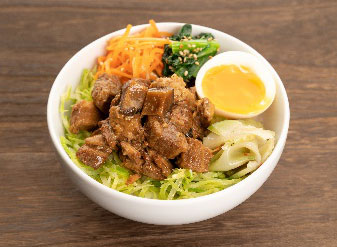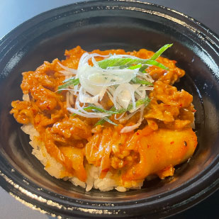 メニュー紹介:定番の豚キムチをオリジナルで味付けし、丼にしました!試合前に豚キムパワーを雪若丸と一緒にお召し上がりください!