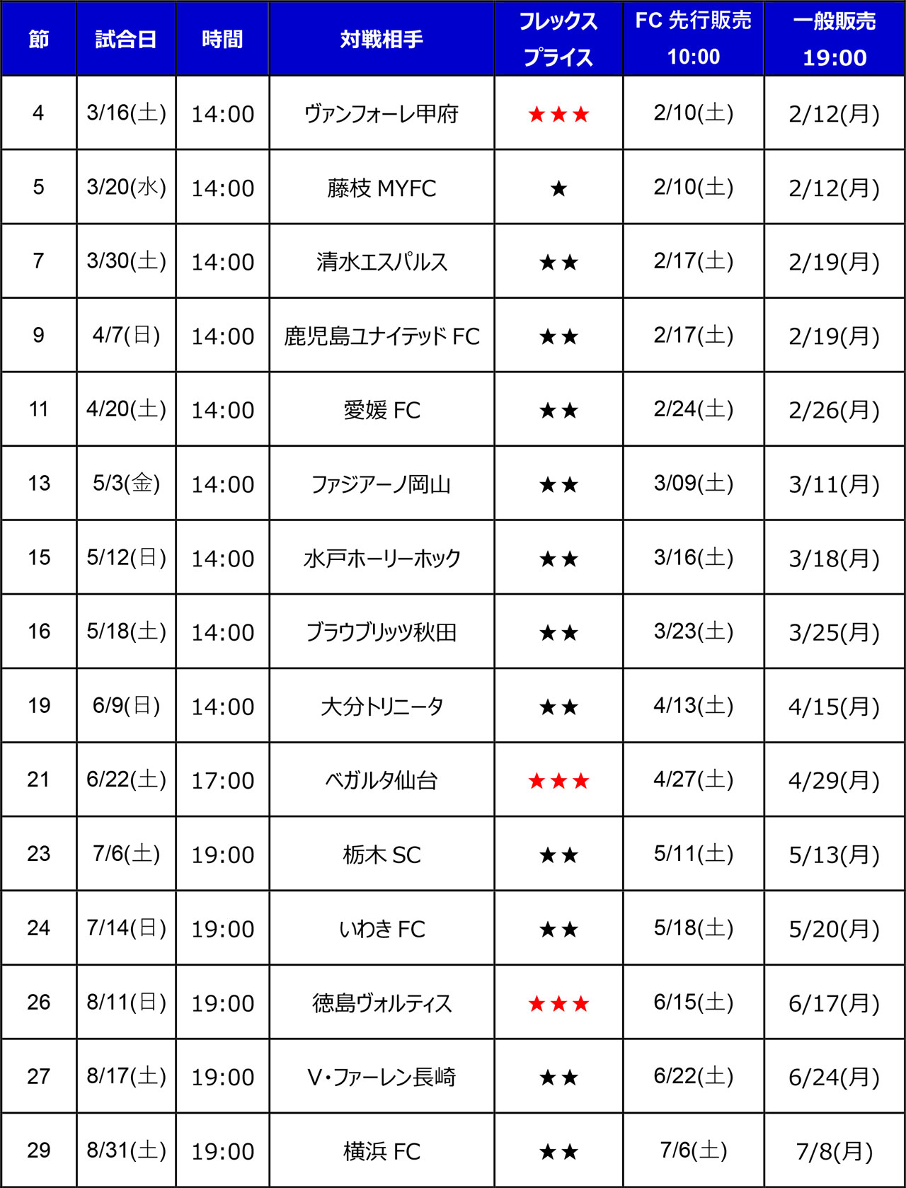 2024シーズン第29節までのホームゲーム観戦チケット、フレックスプライスのグレードが決定しましたので、お知らせ致します。チケット販売方法や価格など、詳細は販売開始時に随時下記リンク先よりご確認ください。