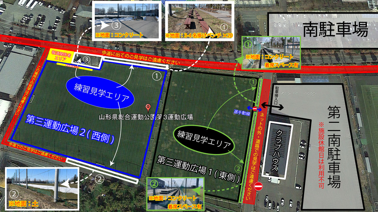 - 山形県総合運動公園の『休館日』の際は南駐車場のみの利用となります。クラブハウス横の第二南駐車場はご利用できませんのでご注意ください。(公園施設配置図はこちらをクリックでご確認いただけます。)