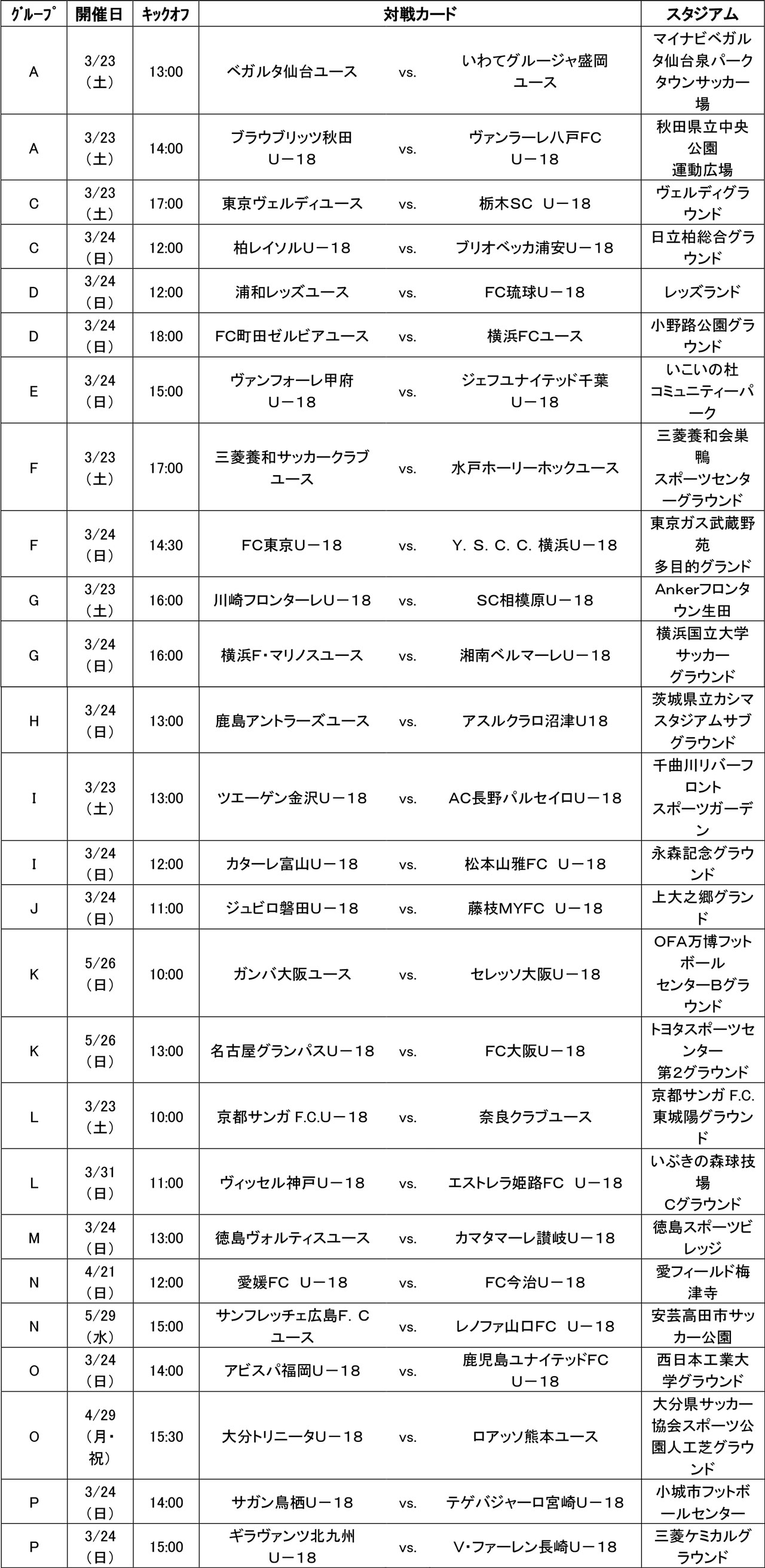 J1・J2・J3の全60チームと日本クラブユース連盟から推薦された4チームの合計64チームを、16グループに分け、各グループ1回戦総当たりのリーグ戦を行う(各チーム3試合)。