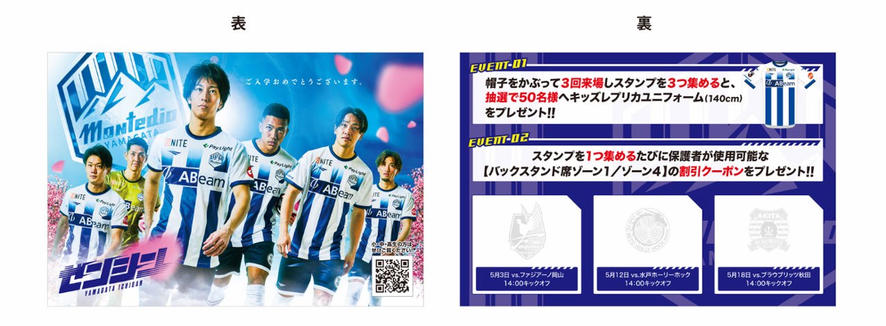 ポストカード裏面に対象3試合でスタンプをもらってください。