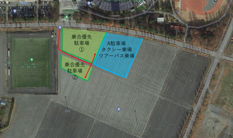 モンテディオ山形では、周辺道路渋滞の緩和、駐車場混雑の対策として、乗り合いで来場されたお車の優先駐車場設置運用をいたしますのでお知らせいたします。