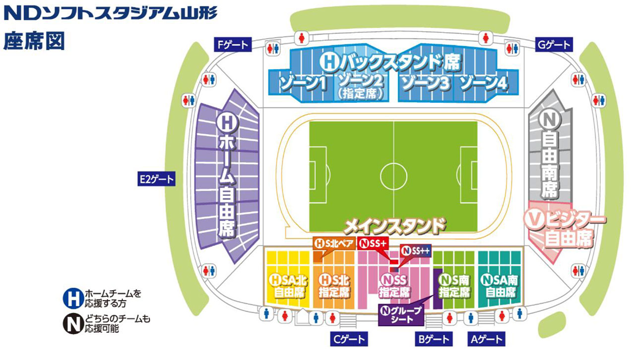 ※メインスタンドSS++指定席、SS+指定席・SS指定席・S南指定席・グループシート・SA南自由席・自由南席がニュートラルエリア(上記図「N」)となり、ビジターチームを応援されるお客様も、ビジターチームユニフォーム着用での観戦が可能です。