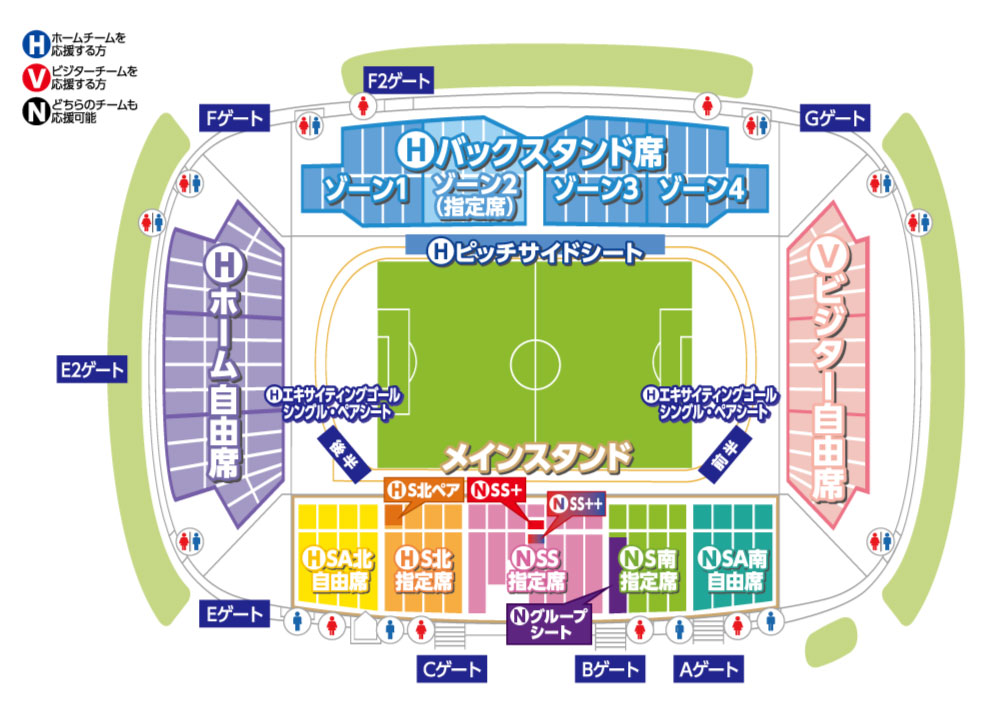 ※メインスタンドSS++指定席、SS+指定席・SS指定席・S南指定席・グループシート・SA南自由席がニュートラルエリア(上記図「N」)となり、ビジターチームを応援されるお客様も、ビジターチームユニフォーム着用での観戦が可能です。メインスタンドS北指定席、SA北自由席、バックスタンド席及びホーム自由席でのビジターチームの応援及びビジターグッズの着用はできません。