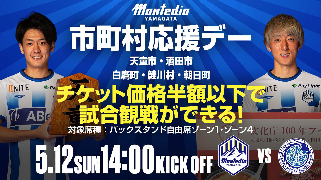 2024年5月12日(日)開催のホームゲーム 水戸ホーリーホック戦は、「天童市・酒田市・白鷹町・鮭川村・朝日町」の市町村応援デーです。