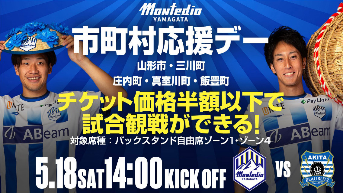 2024年5月18日(土)開催のホームゲーム ブラウブリッツ秋田戦は、「山形市・三川町・庄内町・真室川町・飯豊町」の市町村応援デーです。