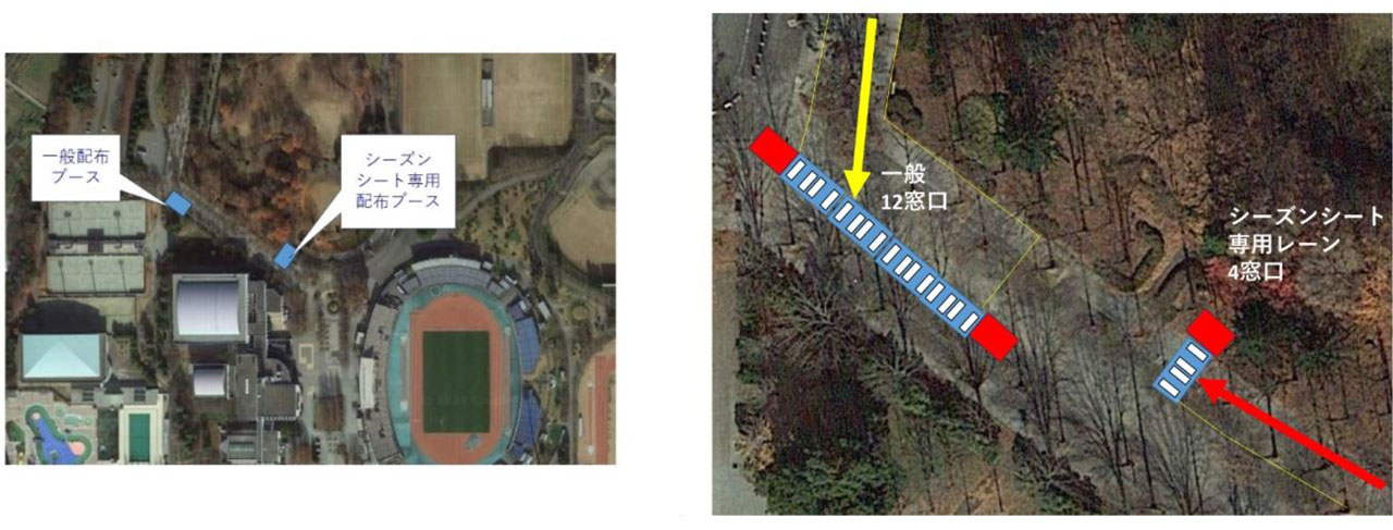 尚、代表者が複数枚を受け取る場合で、シーズンシート、一般チケットが混在されている場合は一般へお並び下さい。(例:親の方がシーズンシート、お子様が一般で親の方が代表してお並びになる場合は、一般窓口での配布となります。)