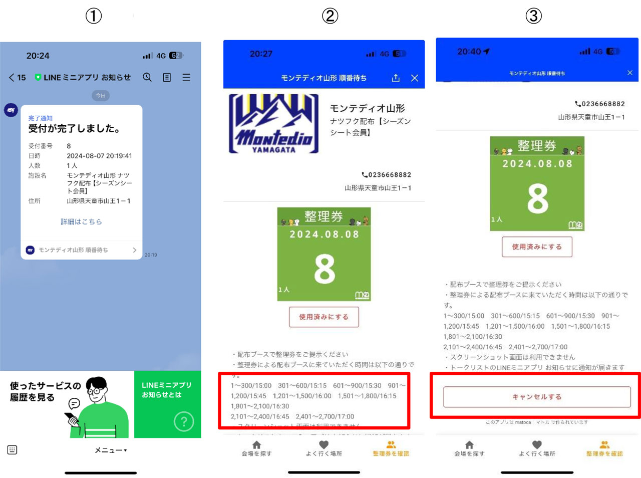 ③整理券をキャンセルする際は、キャンセルボタンをタップください。