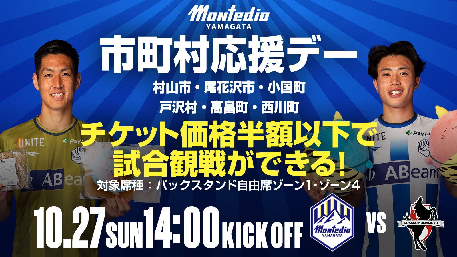 2024年10月27日(日)開催のホームゲーム ロアッソ熊本戦は、「村山市・尾花沢市・小国町・戸沢村・高畠町・西川町」の市町村応援デーです。