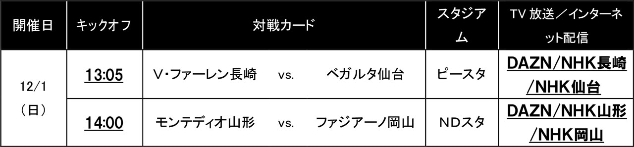 12月1日(日)に開催の「2024J1昇格プレーオフ」準決勝のキックオフ時刻ならびにテレビ放送が下記の通り決定しましたのでお知らせいたします。