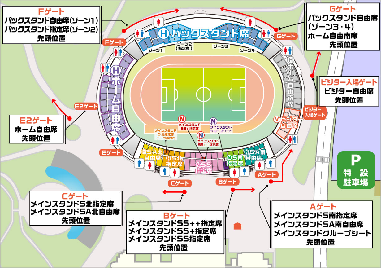 - ホームゲーム開催時には、混雑緩和のため交通規制が敷かれる場合がございます。各種案内板や係員の誘導などに従い、スムーズな運営が出来ますようご協力下さい。