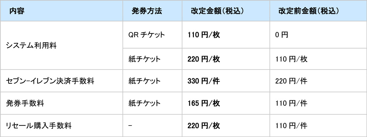 ただしQRチケット・紙チケットいずれの場合も割引クーポンコードの適用により券面金額が0円となった場合は、改定後のシステム利用料が発生します。
