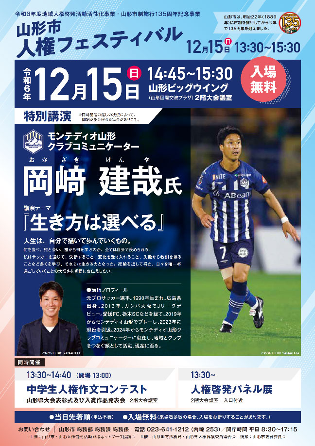 12月15日(日)山形市人権フェスティバルにて、モンテディオ山形「岡﨑建哉」クラブコミュニケーターによる、特別講演会【生き方は選べる】を開催いたします!