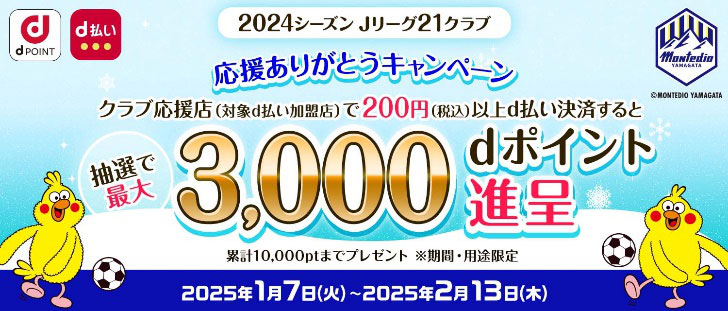 キャンペーン期間中に対象店舗(「d払いⓇ」加盟店かつモンテディオ山形応援協力店)での「d払い」決済で「dポイント」(期間・用途限定)がその場で当たる!