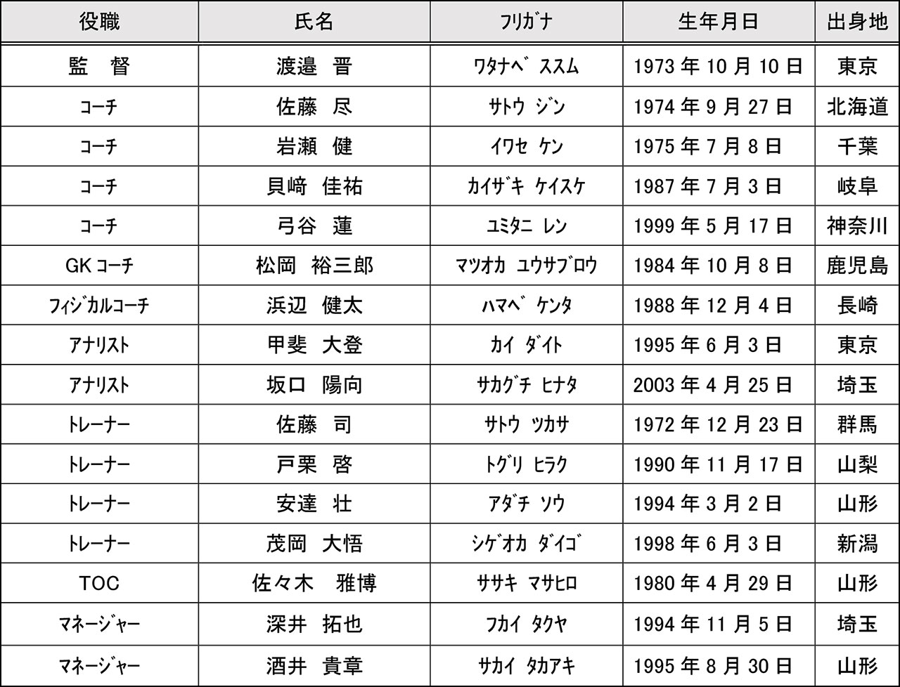 公開日 2025.01.11 2025トップチームスローガンならびにトップチーム新体制について モンテディオ山形2025シーズンのスローガン、トップチームの新体制を次の通りお知らせいたします。 2025シーズン クラブスローガン 2025シーズン トップチームスタッフ ※通訳の加入については後日お知らせいたします。 2025シーズン トップチーム選手名・背番号一覧 #チーム ニュース一覧