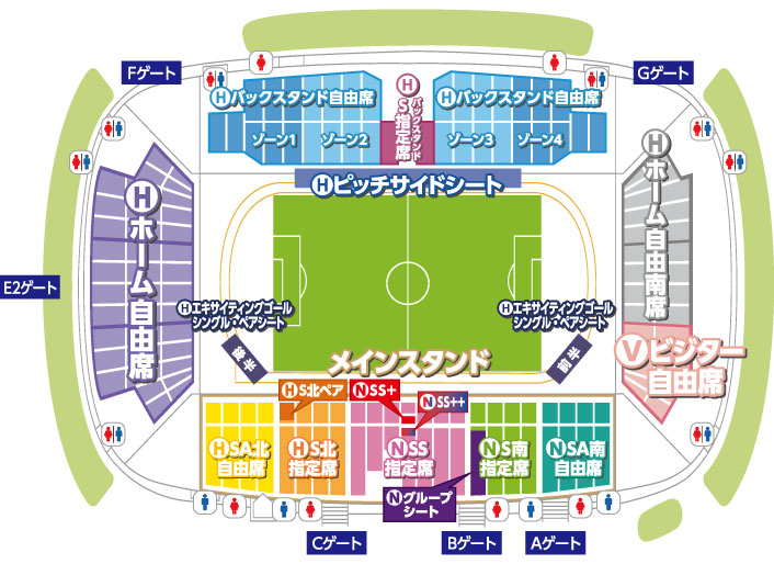 - ホーム自由南席、ビジター自由席のエリアの境界線は販売状況により変更となる場合があります。