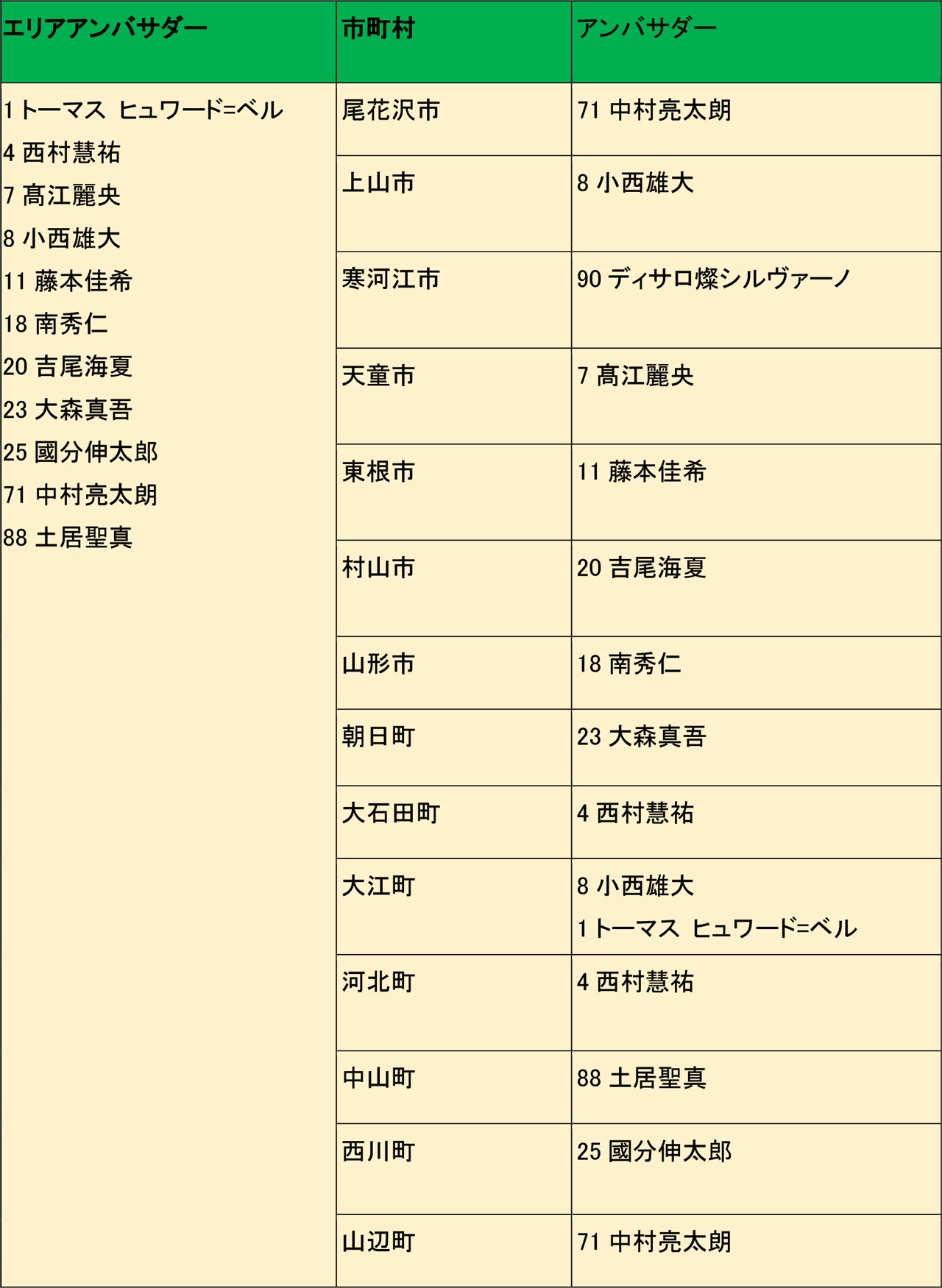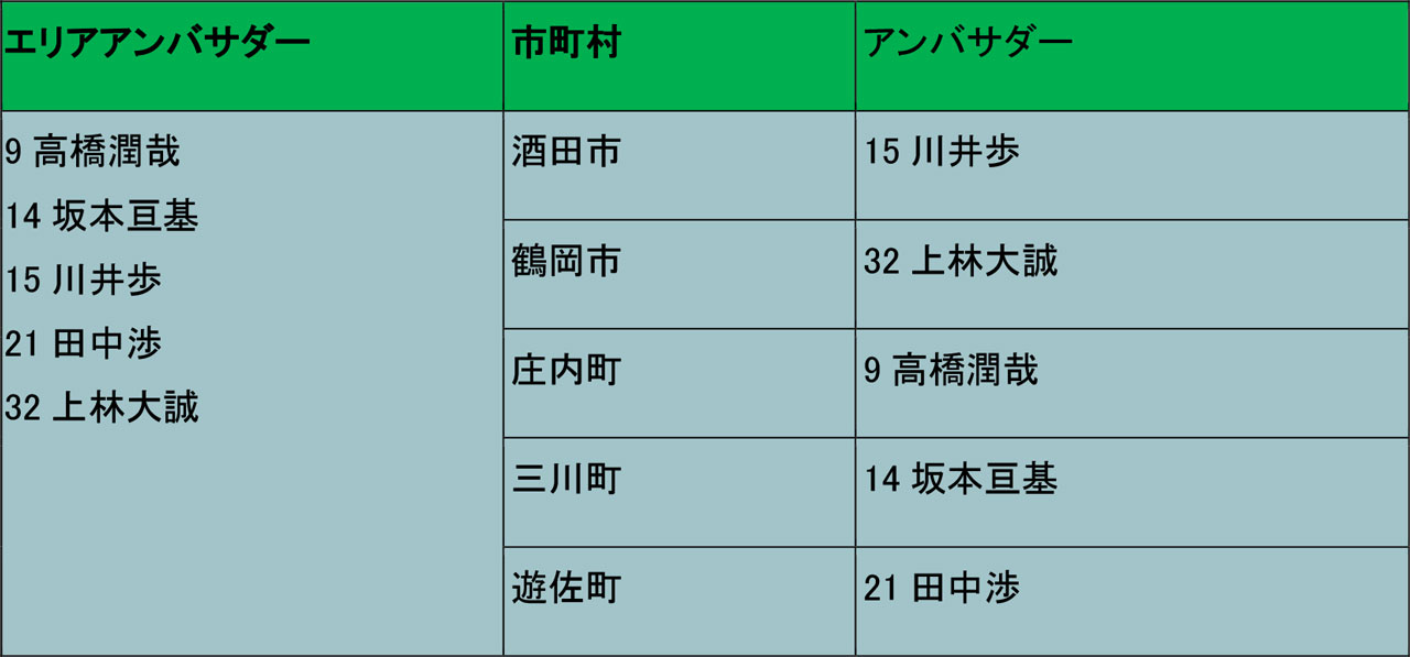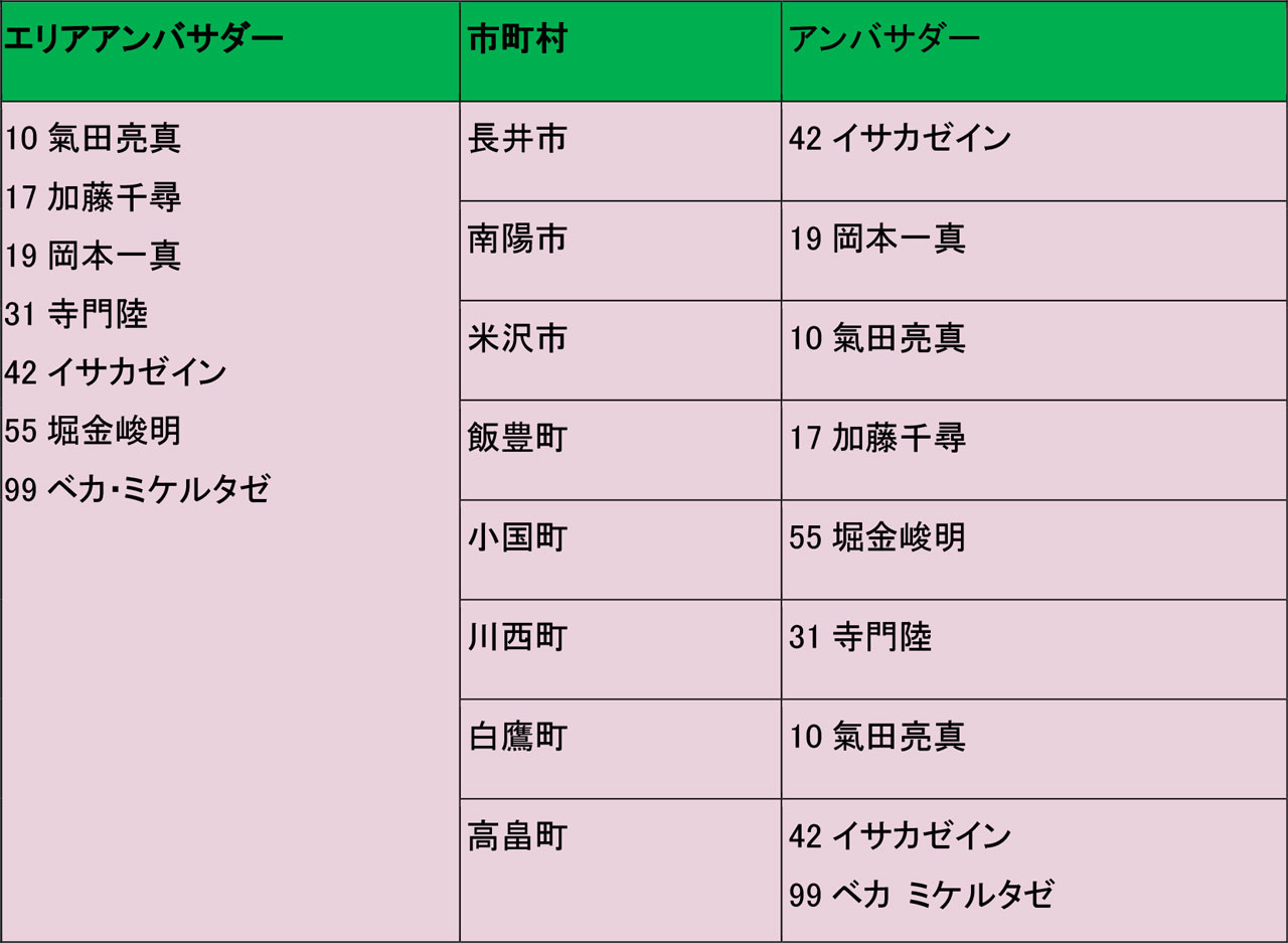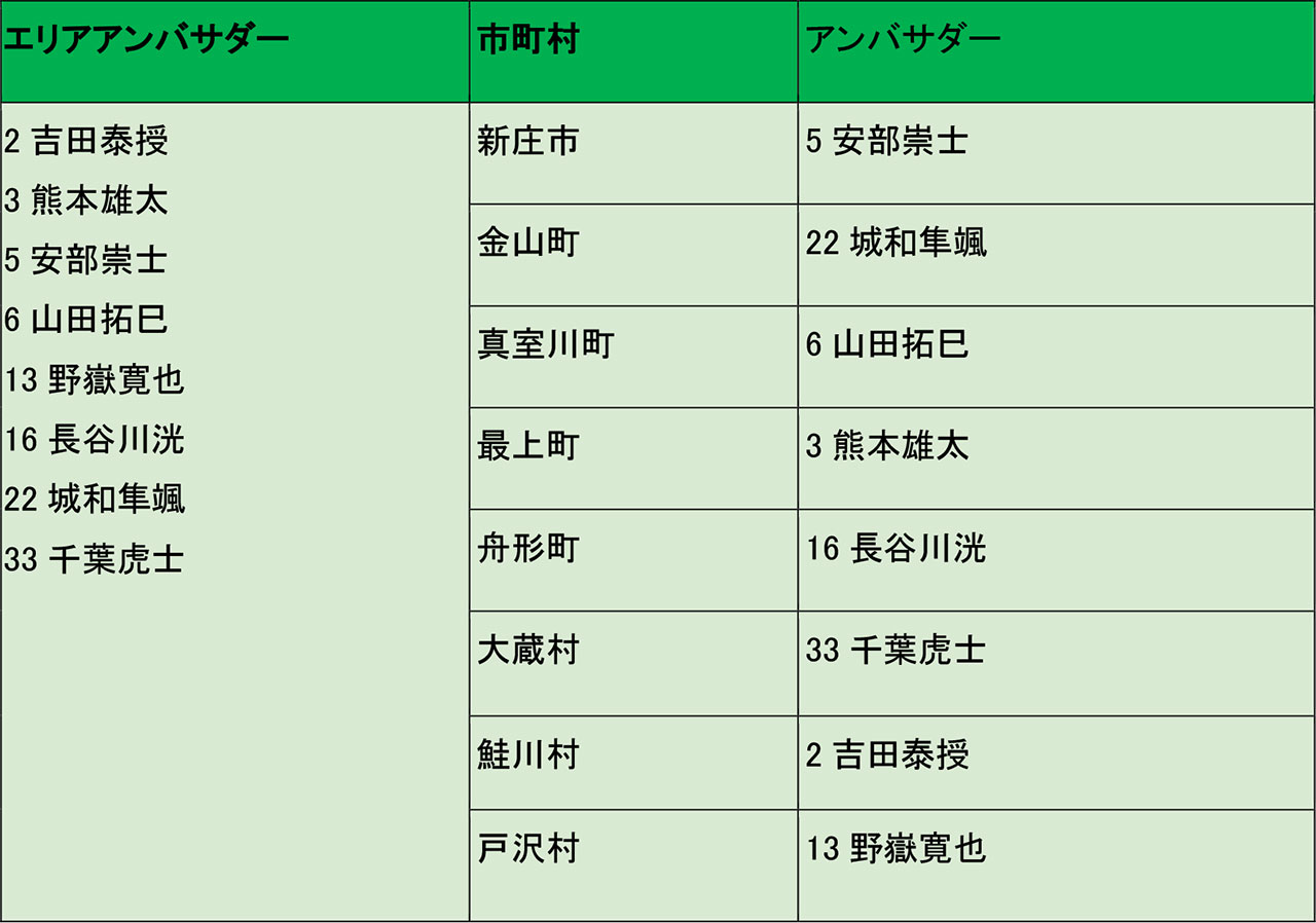 - 山形県内各市町村に1名の選手がPR/広報アンバサダーを担当する。