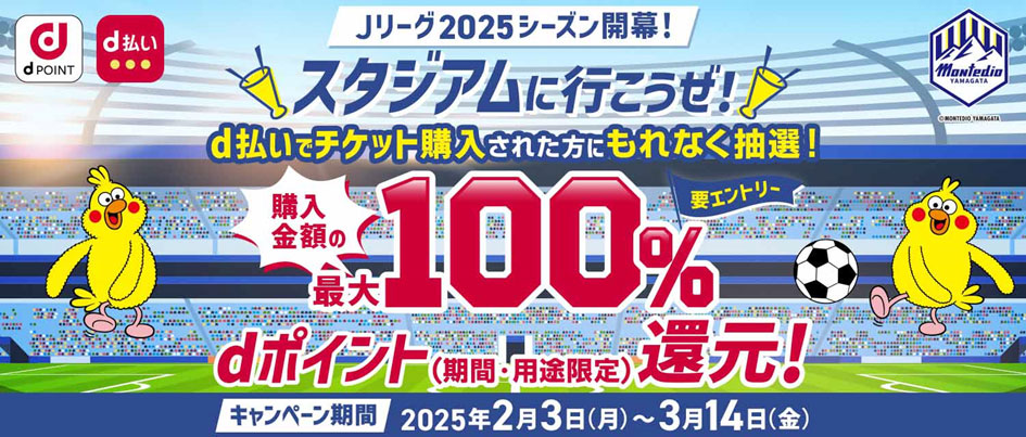 株式会社モンテディオ山形は、株式会社NTTドコモと締結した「モンテディオ山形」を中心とした地域経済活性化に関する協業契約に基づき「Jリーグ2025シーズン開幕!スタジアムに行こうぜ!キャンペーン」を実施いたします。