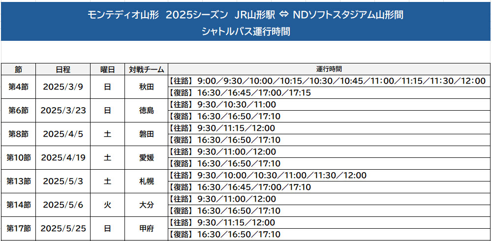 2025年3月9日(日)から開催される2025明治安田J2リーグモンテディオ山形のホーム開催試合に合わせて、株式会社JTB山形支店様と共にスタジアムへの交通手段として下記の通りシャトルバスの運行を実施いたしますのでお知らせいたします。