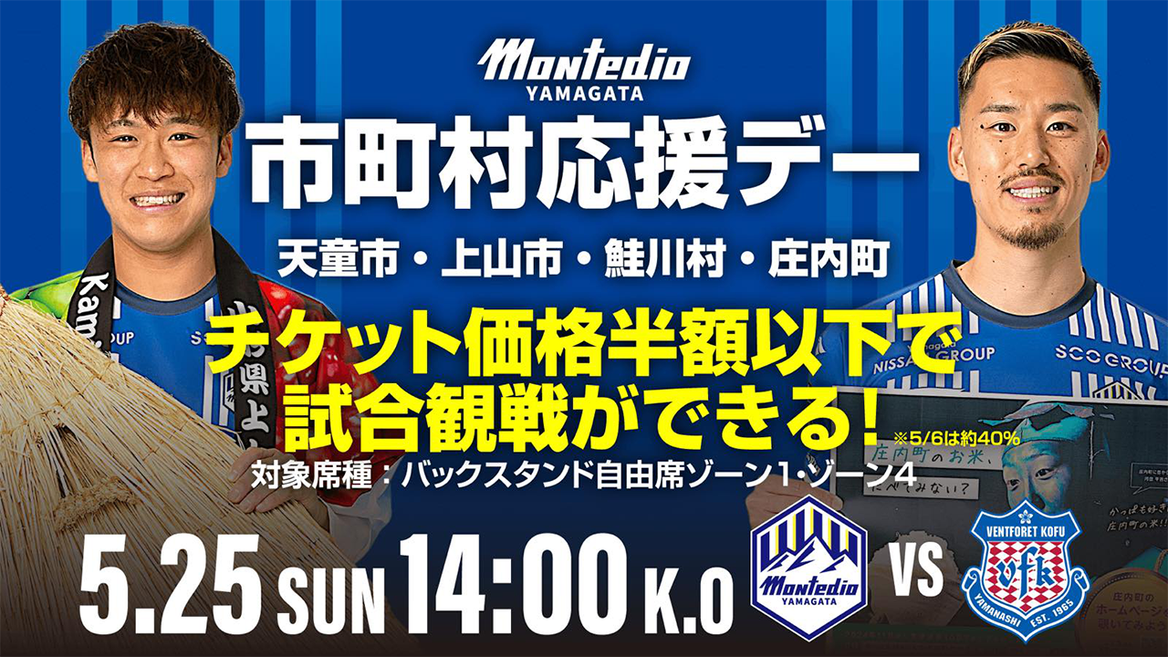 2025年5月25日(日)開催のホームゲーム ヴァンフォーレ甲府戦は、「天童市・上山市・鮭川村・庄内町」の市町村応援デーです。
