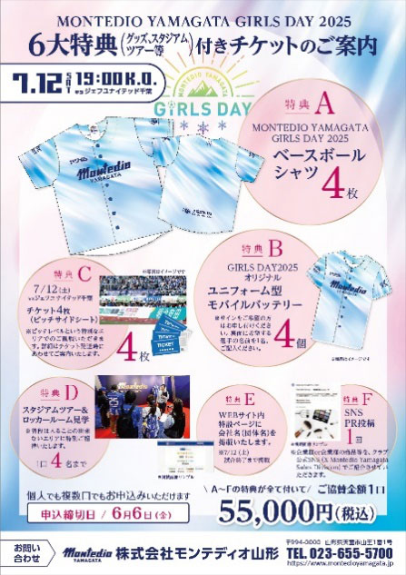 7月12日(土)ジェフユナイテッド千葉戦「モンテディオ山形ガールズデー2025」に合わせて、ご観戦にピッタリな応援アイテムと観戦チケットのお得なパッケージを販売いたします!このパッケージ限定のオリジナルデザインのグッズ&スタジアムツアーで、女性もスタジアムを満喫しよう!