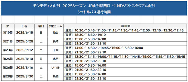 2025明治安田J2リーグモンテディオ山形のホーム開催試合にスタジアムへの交通手段として、シャトルバスの運行をしております。6月以降の時刻が決定しましたのでお知らせいたします。