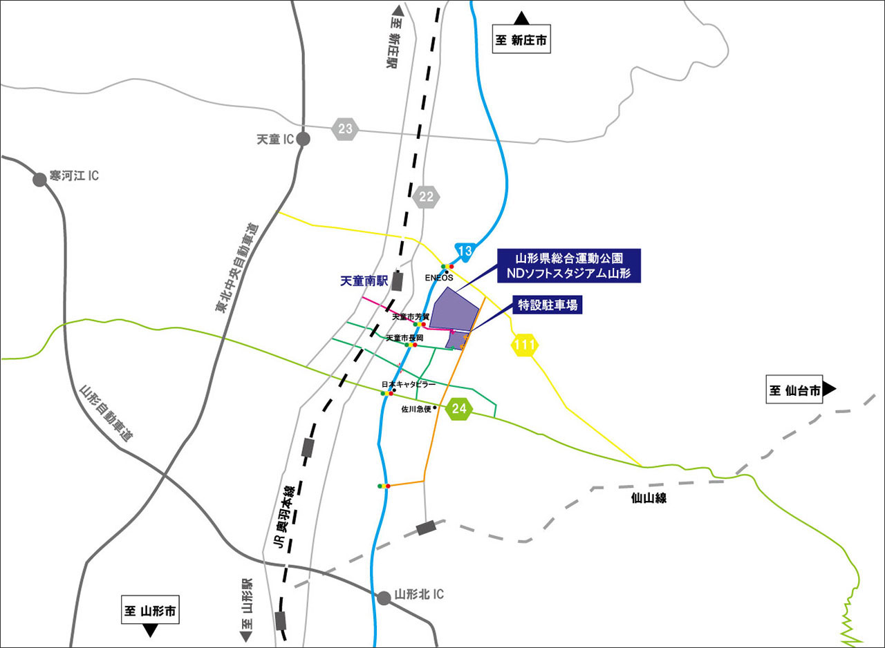 - 山形市方面からは、国道13号より県道24号の交差点を右折し南側および東3出入口へのルート推奨