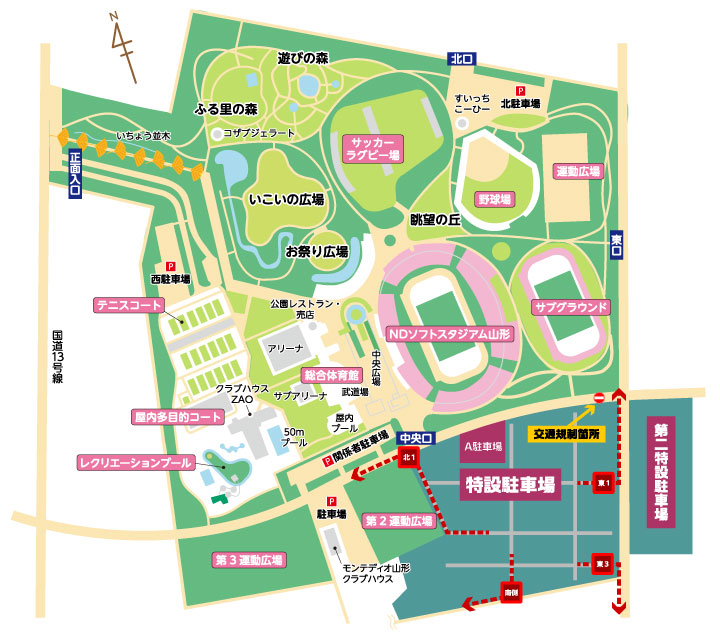 - NDソフトスタジアム山形のある山形県総合運動公園は、夜間22:00~翌朝5:00まで閉園となります。それに伴い駐車場も閉鎖となりますので、ご注意ください。