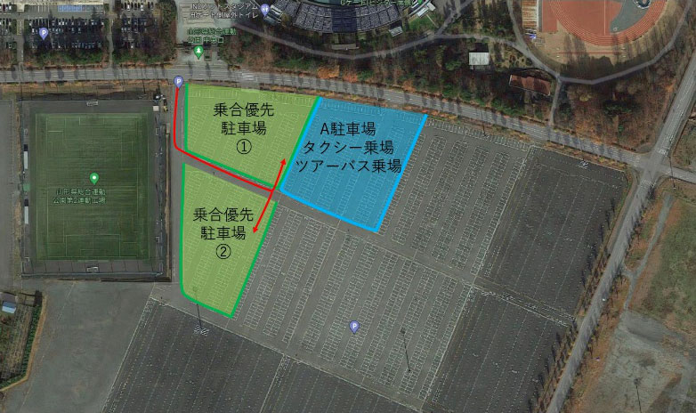 - ホームゲームを観戦するお客様の駐車場は、スタジアムの南側に併設している無料特設駐車場をご利用ください。