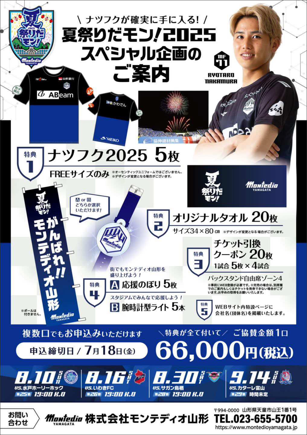 8月10日(日)から9月14日(日)の期間に開催される「モンテディオ山形夏祭りだモン!2025」に合わせて、ご観戦にピッタリな応援アイテムと観戦チケットのお得なパッケージを販売いたします!