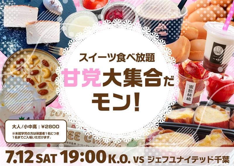 7月12日(土)に開催されるホームゲーム・ジェフユナイテッド千葉戦にて、特別企画「スイーツ食べ放題 甘党大集合だモン!!」を開催いたします。