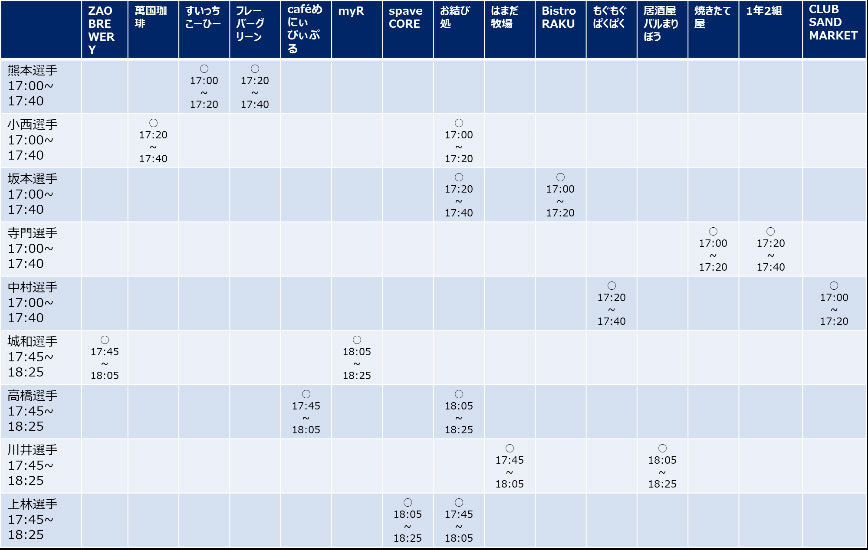 | 参加選手 | ①熊本雄太選手・小西雄大選手・坂本亘基選手・寺門陸選手・中村亮太朗選手 ②高橋潤哉選手・川井歩選手・城和隼颯選手・上林大誠選手 ※コンディションにより、選手は変更・不参加となる場合があります。 |