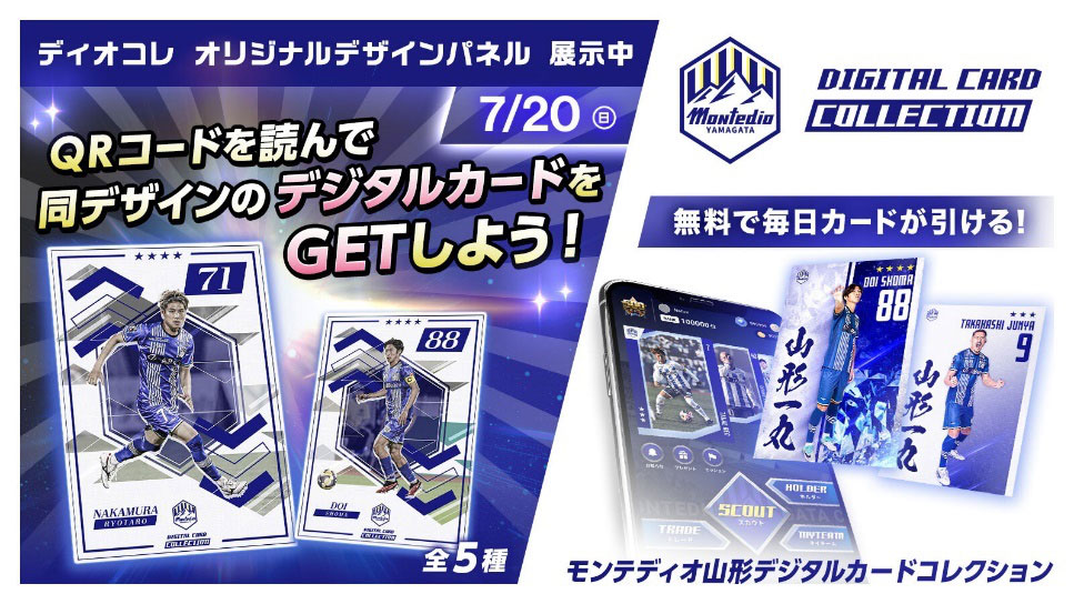 | 内容 | モンテディオ山形デジタルカードコレクション(ディオコレ)からは選手たちの熱いプレー写真を使用したオリジナルデザインのフォトパネルを展示!展示場に掲示したQRコードを読み込むと、同じデザインのデジタルカードも入手できます! さらに、抽選で実際に使用されたフォトボードが当たるプレゼント企画も実施します。 ぜひディオコレ限定カードをゲットしてください! |
