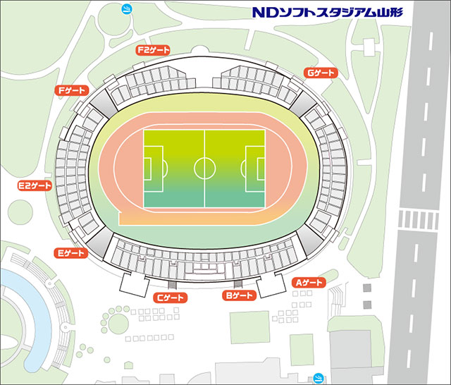 - 試合開催時は、特設駐車場をご利用ください。山形県総合運動公園内に設置されている北駐車場・南駐車場・西駐車場は他大会利用者の利用により満車になる場合があります。