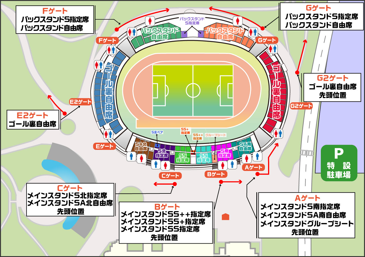 試合開催当日からシート等による順番待ちが可能です。各入場ゲートの先頭位置については下図をご参照ください。