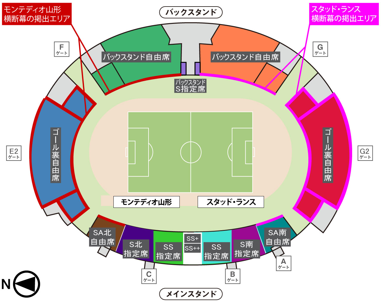 - ゴール裏自由席(モンテディオ山形側)、ゴール裏自由席(スタッド・ランス側)の最前列以外での大旗の使用を禁止しています。