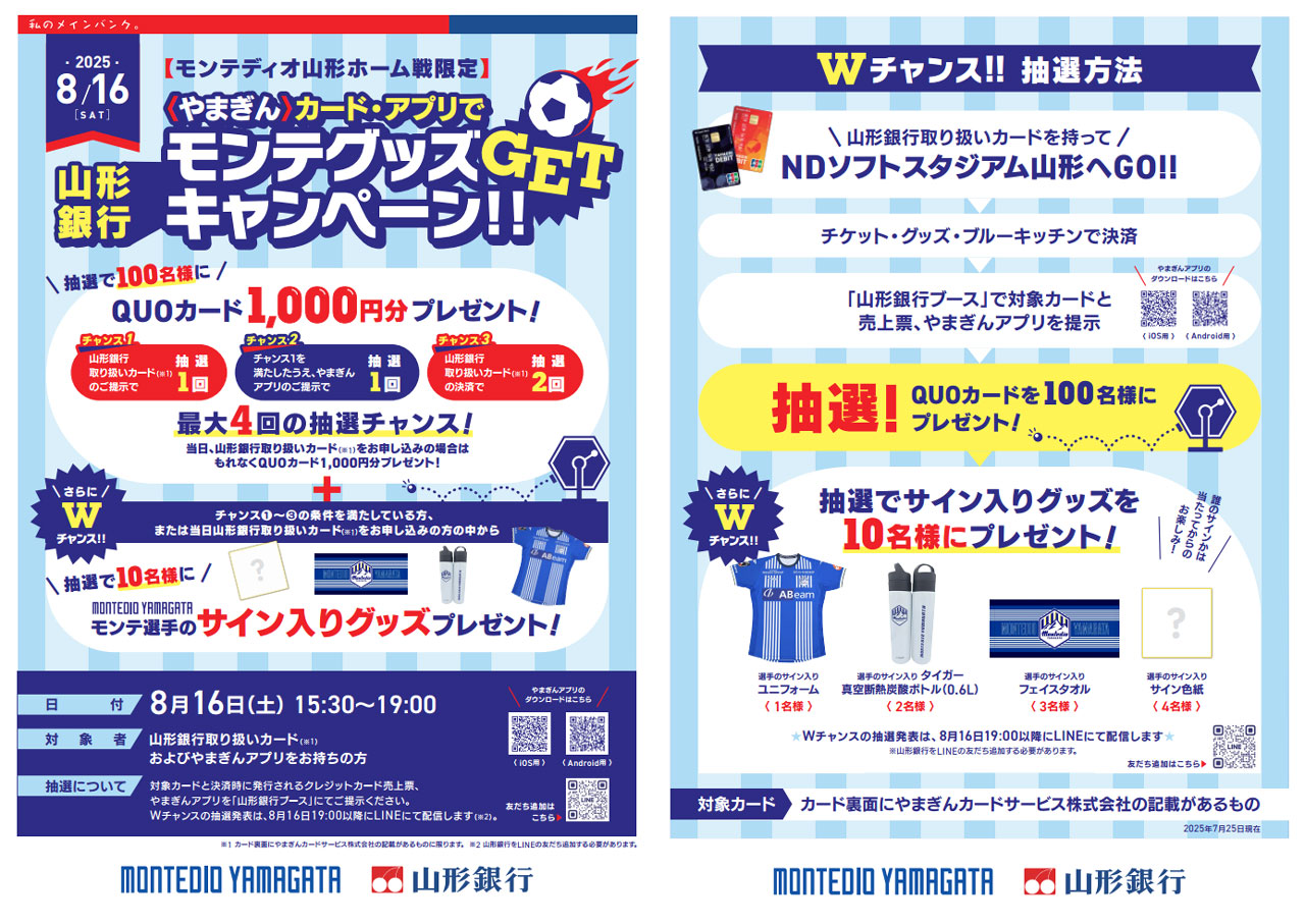 すでにご案内のとおり、当日はNDソフトスタジアム山形の中央エリアにて、山形銀行様による限定キャンペーン「〈やまぎん〉カード・アプリでモンテグッズ GET キャンペーン」を開催予定です。ご来場の皆さまにお楽しみいただける内容をご用意しておりますので、改めて以下の通りご案内申し上げます。